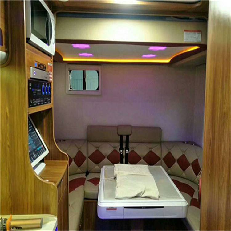 车门处一眼就能看到的是厨房区,上方配备了车载微波炉、车载抽油烟机和燃气报警器,操作台面上为进口燃气双灶和洗菜池。厨房旁边是封闭式卫生间。整车采用进口全自动水路系统,卫生间配有电动抽水粉碎式马桶、不锈钢面盆、淋浴花洒、排风扇、化妆镜等,车内配有换热式热水器,满足日常需求。