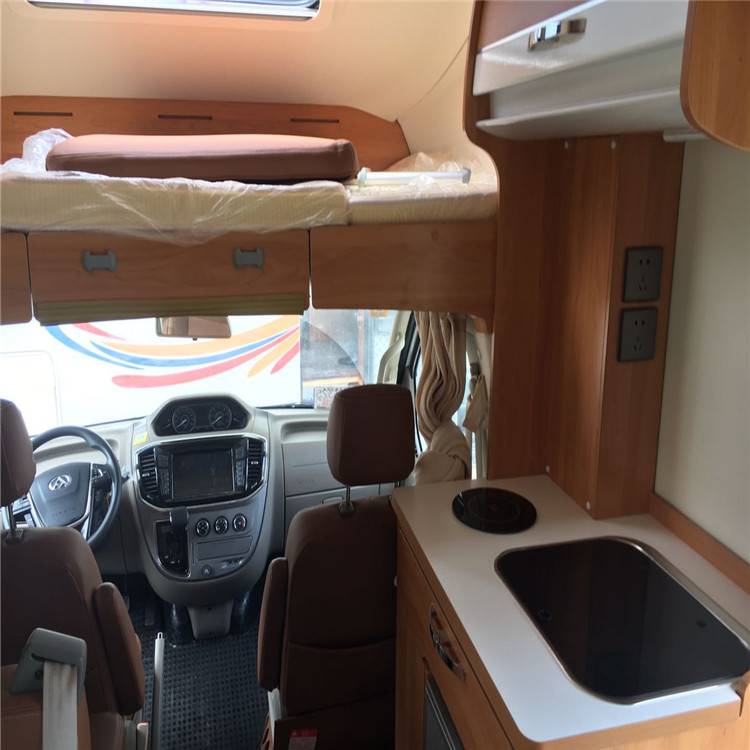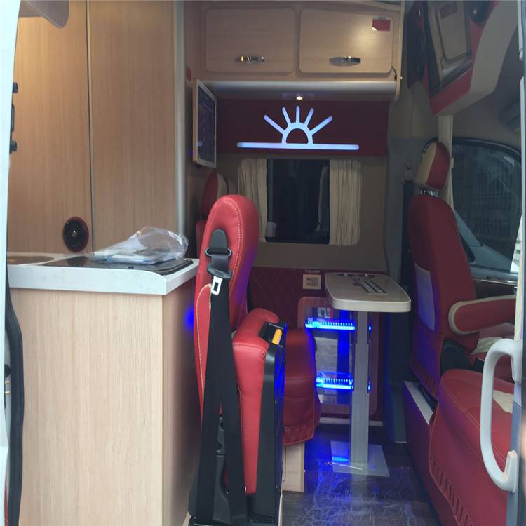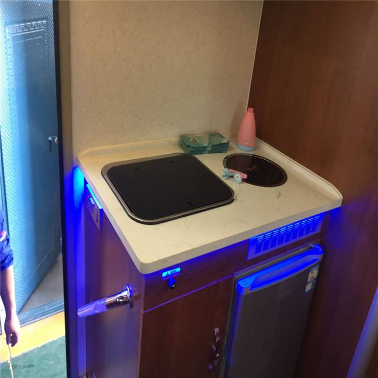 厨房配备900W电磁炉,台下式隐藏洗菜池,90L进口房车**冰箱,微波炉,储物柜等,可进行加装外置厨房,以达到更高标准的烹饪需求。车内配备了氛围灯,19寸可折返液晶电视,进口车载影音系统等娱乐设施。冷暖系统设有**置驻车空调,进口柴油暖风系统等。