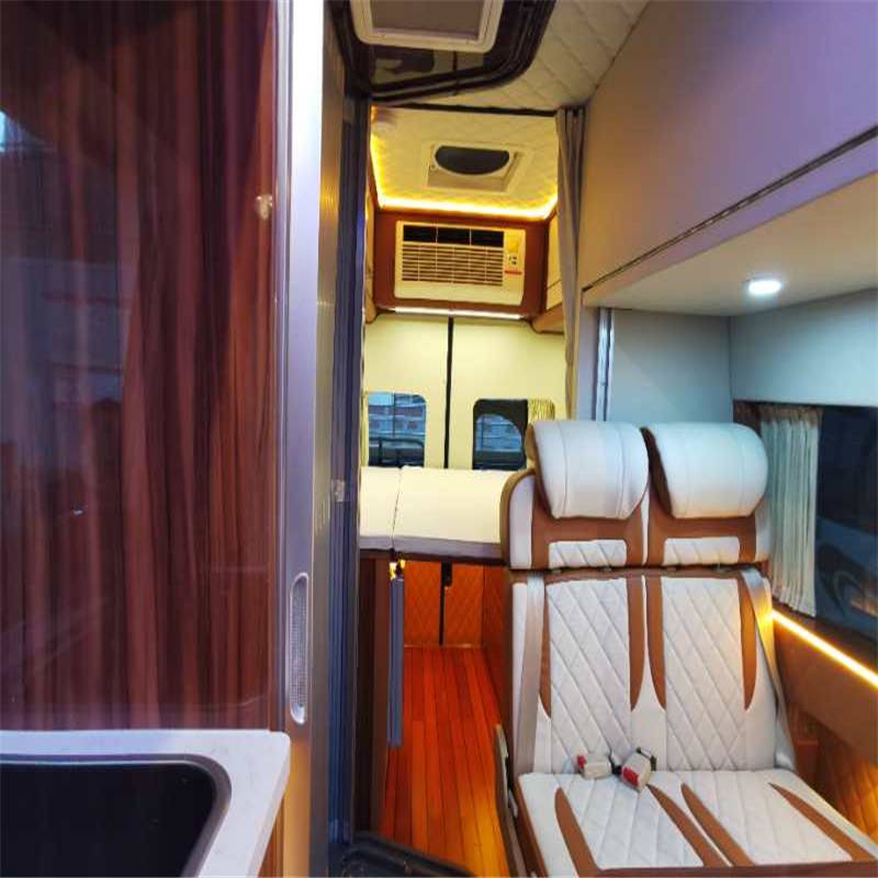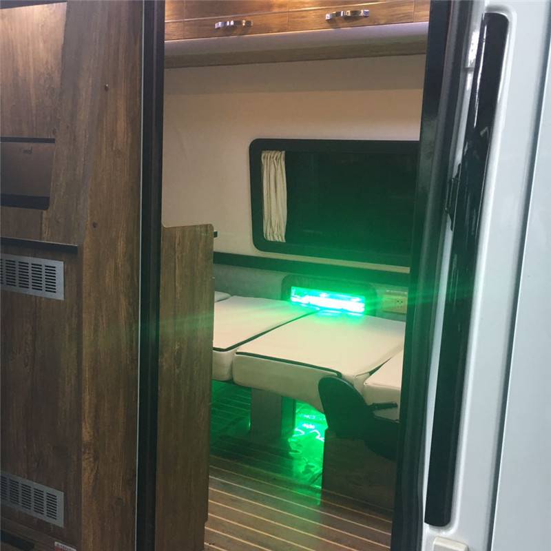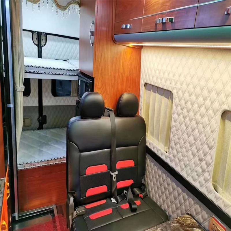 车辆会客区后方是厨房区、卫生间区与尾床区。厨房区采用长条状布局,配备了带盖板的水槽,在旁边是一台50L房车**卧式冰箱,桌子下方还配备了消毒碗柜,让旅途中使用餐具也能更加卫生。厨房区上方是一台韩国大宇微波炉。尾床区采用子母床设计,需要睡眠时不用繁琐的折叠,省去了不少麻烦,上铺尺寸为1950×800(mm),下铺尺寸为1950×1000(mm)。