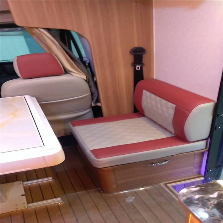 这辆基于依维柯欧胜V45-33底盘打造的房车和8AT轻客尺寸完全相同,外观尺寸为5999 × 2011 × 2754/2910mm,而加装了空调组件以后整车的高度为3005mm。依维柯小**房车车厢中部4人位环绕型卡座,既可提供会客、餐饮的功能,也可通过调节升降餐桌,打造一个舒适的榻榻米床位空间。卡座上方的电动升降双人床