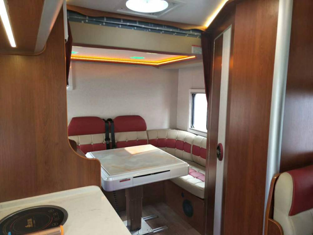 车厢采用经典的贯通式布局,从前至后依次为驾驶室、会客区、厨房区、休息区、洗手间。不过布局虽经典,却处处显露着新意。会客区的设计集商务与家用为一体,搭配可旋转的驾驶室座椅,共可容纳4-5人落座。餐桌不仅可以便捷前后移动,还可自由升降,与座椅拼接成为床位,以供夜晚休息。同时,一台32寸的液晶电视与两个成员音响可满足日常娱乐使用;大尺寸天窗则让此区域保持了良好的采光和通风性。