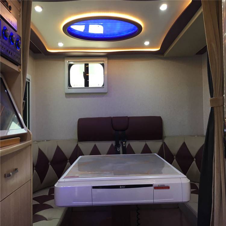 车厢采用经典的贯通式布局,从前至后依次为驾驶室、会客区、厨房区、休息区、洗手间。不过布局虽经典,却处处显露着新意。会客区的设计集商务与家用为一体,搭配可旋转的驾驶室座椅,共可容纳4-5人落座。餐桌不仅可以便捷前后移动,还可自由升降,与座椅拼接成为床位,以供夜晚休息。同时,一台32寸的液晶电视与两个成员音响可满足日常娱乐使用;大尺寸天窗则让此区域保持了良好的采光和通风性。